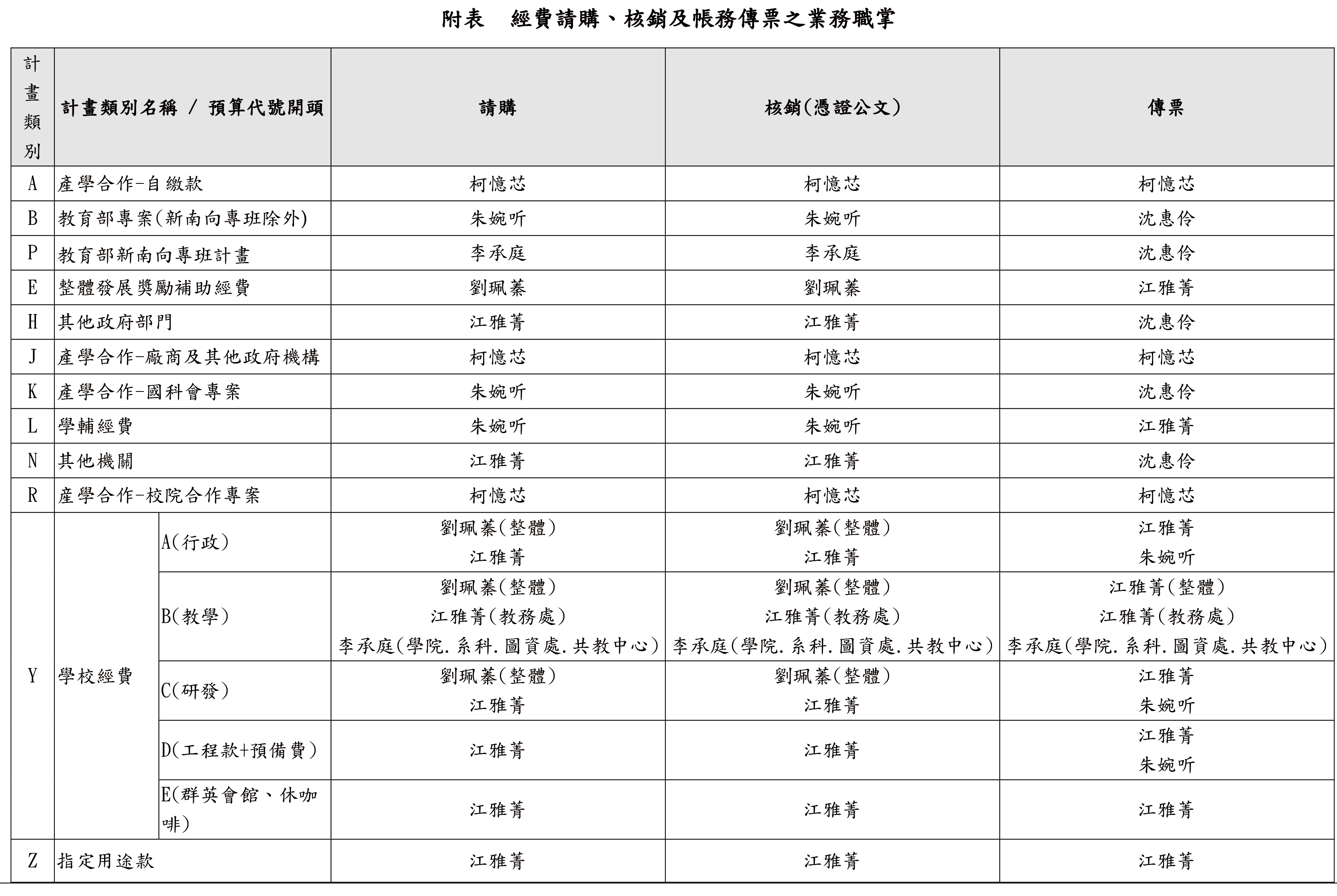 ※經費請購、核銷及帳務傳票之業務職掌詳附表